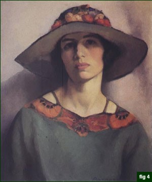 It was in 1922 that Alvarez became a part of the “Group of Eight,” painters who banded together to promote their art which was veering further and further away from the predictable standards of the California Art club. The Eight included Alvarez, her former teacher John Hubbard Rich, Henri de Kruif, Luvena and Edouard Vysekal, Donna Schuster, Roscoe Schrader, and Clarence Hinkle. Critic Antony Anderson observed that the group had “some decidedly modern tendencies,” and they did in relation to standard California Impressionist fare. Just how “Modern” Mabel Alvarez was at this time is best revealed by one of the major paintings of her career, her Self-Portrait of 1923 (fig.4).