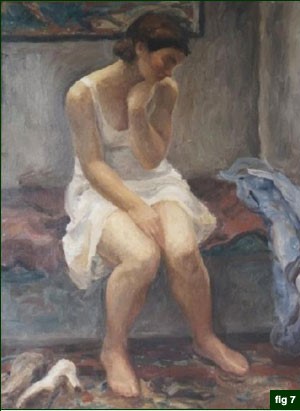 Morgan Russell talked to Mabel Alvarez about artists of common interest, such as Henri Matisse, and he told her to become like a “cork that floats downstream while painting,” to let the process take her where it would. It was at this time, whether or not as a direct result of contact with Russell, that Alvarez’s subject matter became less decorative, mystical, and ambiguous, and more frankly sexual. She turned away from the symbolism of the mid-to-late-1920s work to a series of realistic semi draped figures, most of them of her friend and favorite model Arabella. One entitled simply Morning (fig. 7) won the one-hundred-dollar first prize at the California Art Club’s 1933 Annual Exhibition. In this painting the female figure is seen from the front, seated, with her head resting on her hand and her face turned away from the viewer. She wears a white slip, her hand rests lightly between her thighs. It is an image of restrained eroticism of quiet passion in subdued tonalities. If every poem, painting and song is in some way autobiographical, this lightly dressed figure evokes Alvarez herself, floating downstream as per the advice of Morgan Russell and finding herself adrift in sensual reverie. Indeed, her painting may have been the substitute for the relationship in life she always craved but never found.