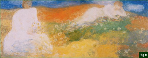 Typical of her late work is Two Women in a Field of Flowers (fig. 9), which alludes to stylistic influences from Milton Avery to Gustav Klimt. Here, any vestige of the dark side of her earlier palette is gone as forms shimmer and dissolve in fields of iridescent color. This painting also restates her long-time interest in women as subject matter, and in themes of youth, growth, and regeneration – all that flowers represent. However, these thematic impulses that found expression in the Symbolist paintings of the 1920s and in the fleshy, realistic painting of the 1930s are here an echo of that earlier searching passion, a formal rearrangement of things remembered. Alvarez certainly borrowed creatively from a variety of sources to keep her picture-making fresh, but her inner journey, the one that had begun so long ago with Impressionist seascapes and faces, had come to rest at a place where only the thoughtful application of color – the “great thing to work for” as she had written in 1928 – mattered. This enthusiasm for color, deeply genuine and always carefully crafted, never waned.